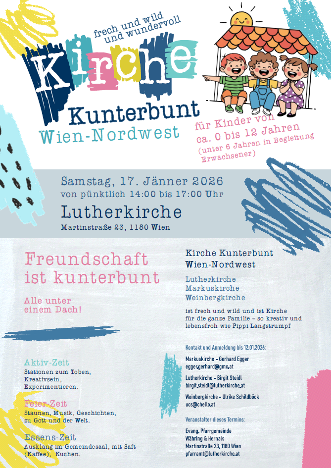Alter: 10 bis 13 Jahren INKU Deutsch Schreiben und Lesen im Sprachniveau A2 bis B1 (abwechselnd Schreiben und Lesen) INKU Deutsch Schreiben und Lesen im Sprachniveau A2 bis B1 (abwechselnd Schreiben und Lesen) INKU Deutsch Schreiben und Lesen im Sprachniveau A2 bis B1 (abwechselnd Schreiben und Lesen)SI Matthias Geist | mit Abendmahl 1. Sonntag nach dem Christtag | L Judith Sautner | mit Abendmahl Markuskirche (Ottakring) und Weinbergkirche (Döbling) | Lutherkirche geschlossen